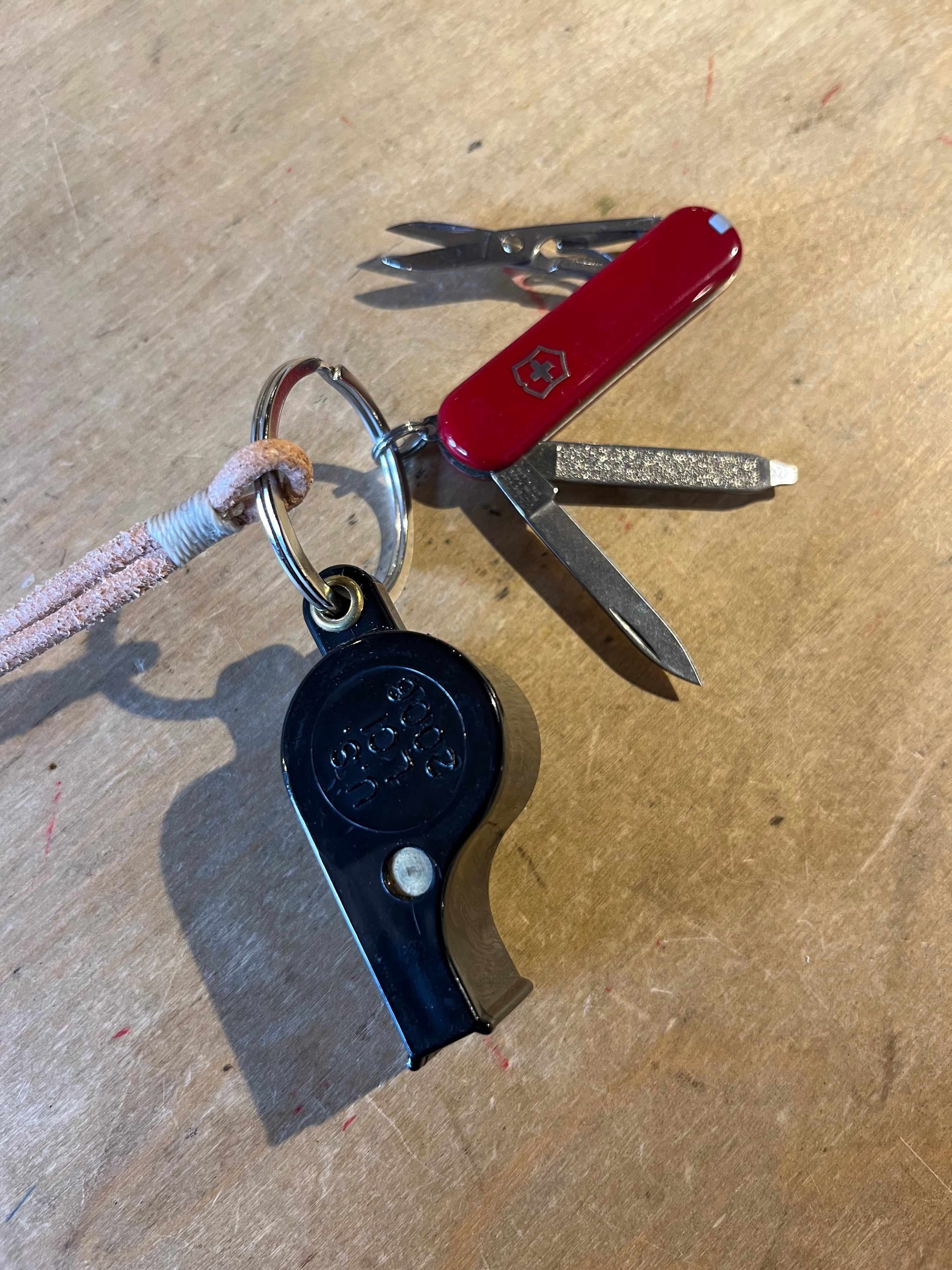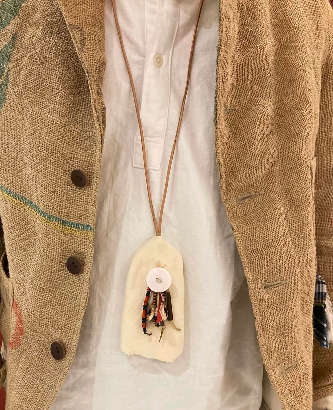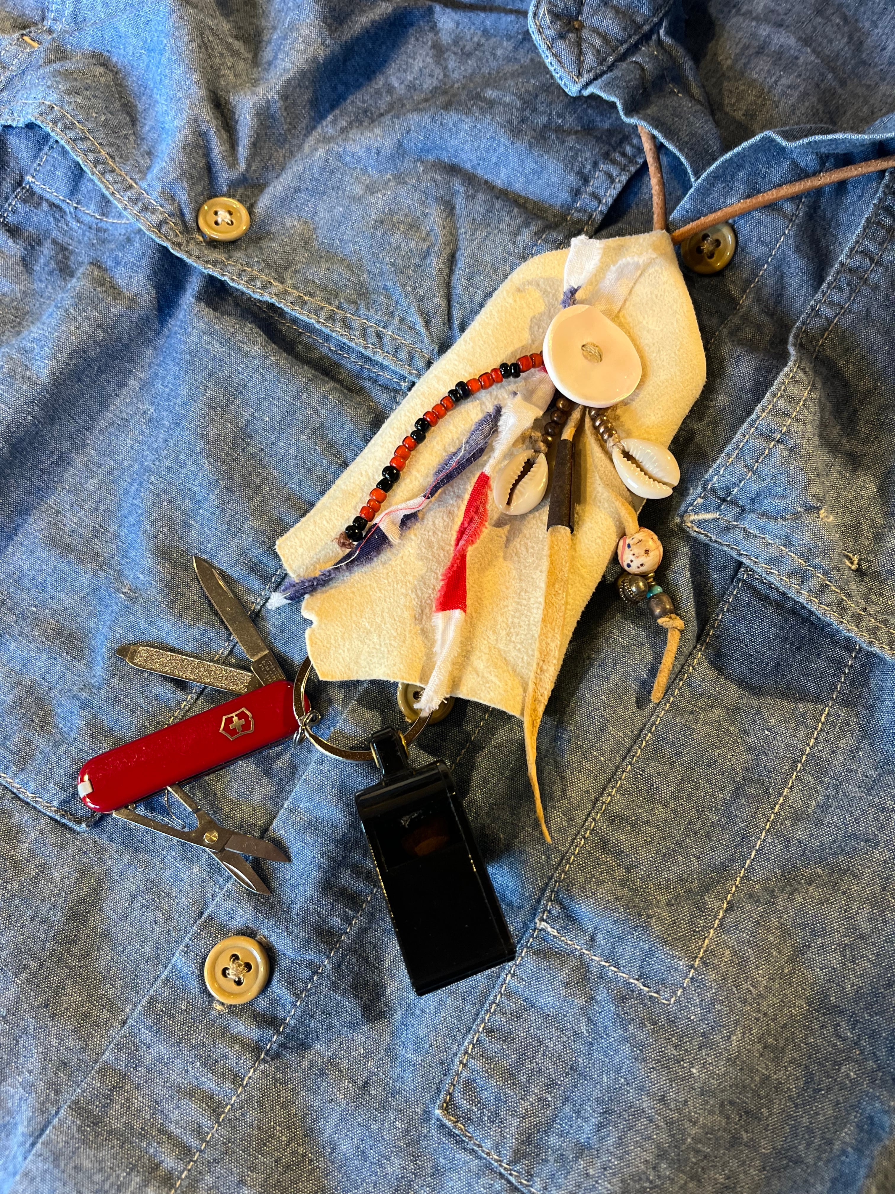 道具としての役目をもつホイッスルとマルチツールをシルバースミス太田さんのアーティスティックな装飾で包み込んだネックレスタイプのミニポーチです。