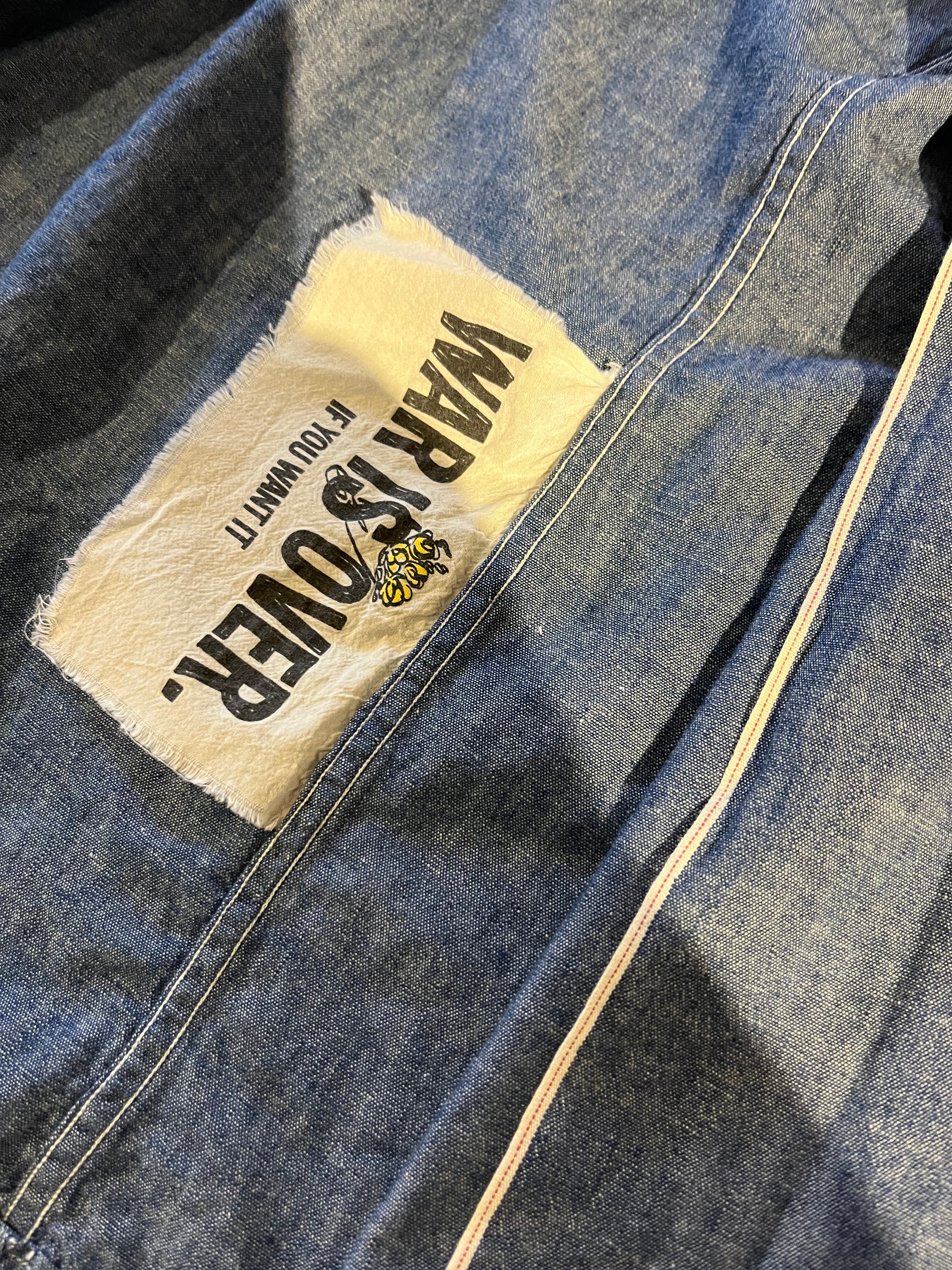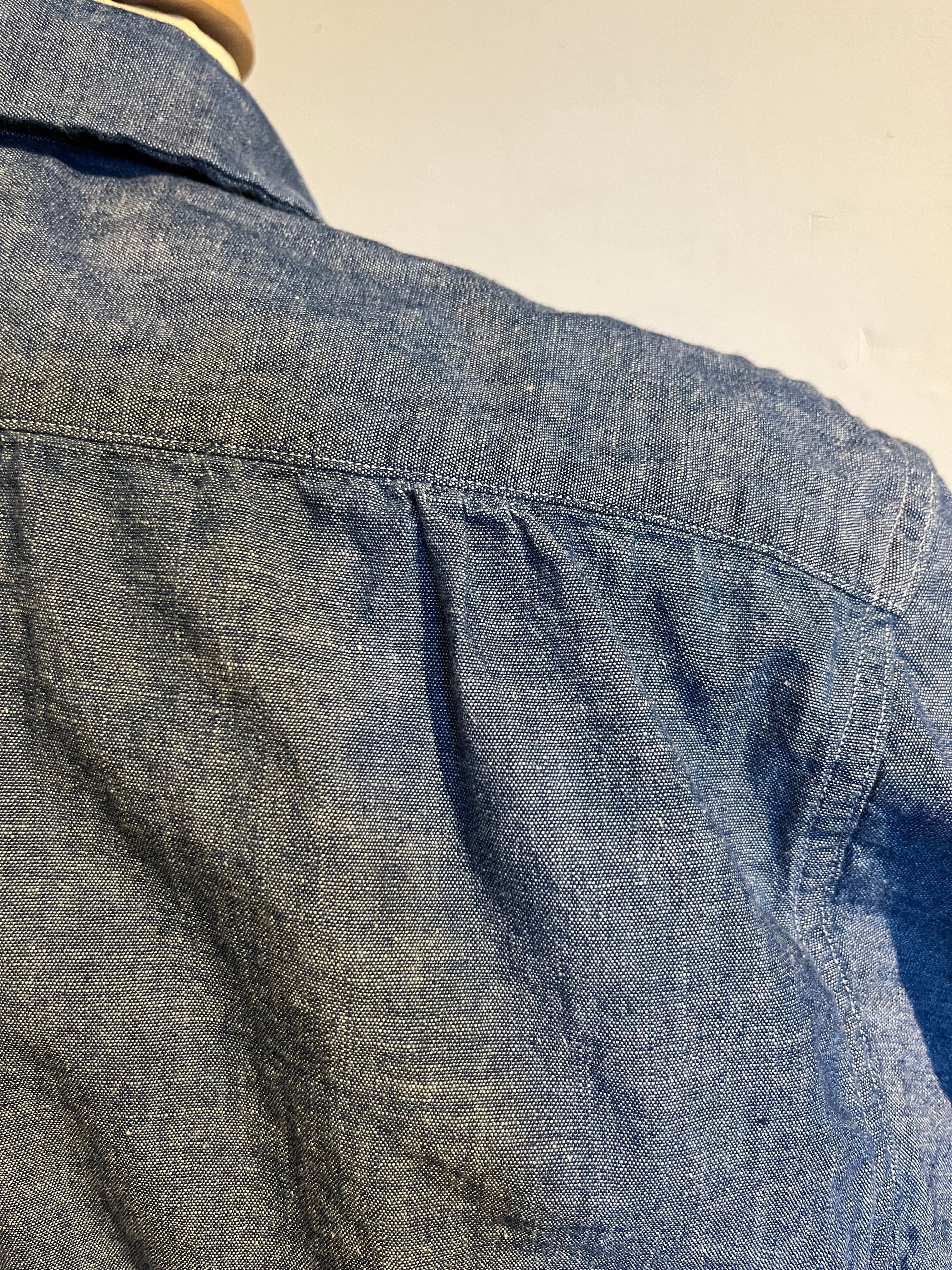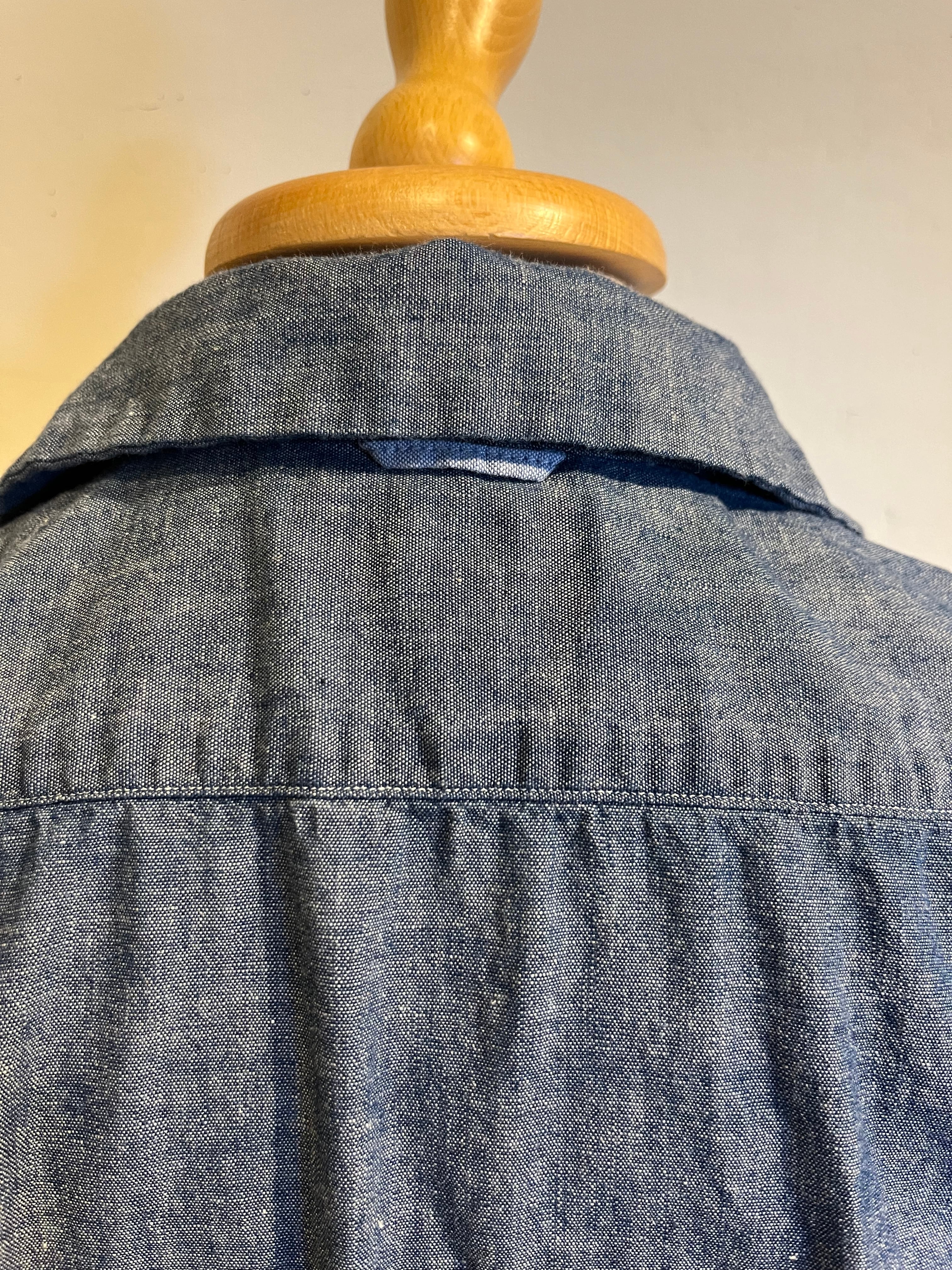 セルビッチシャンブレー生地(耳付き)を採用する事で、フロント見返し部分にオリジナル同様の仕様を再現。これは当時の生地幅と裁断の取り都合、縫製の簡略化による仕様だったと推測しています。